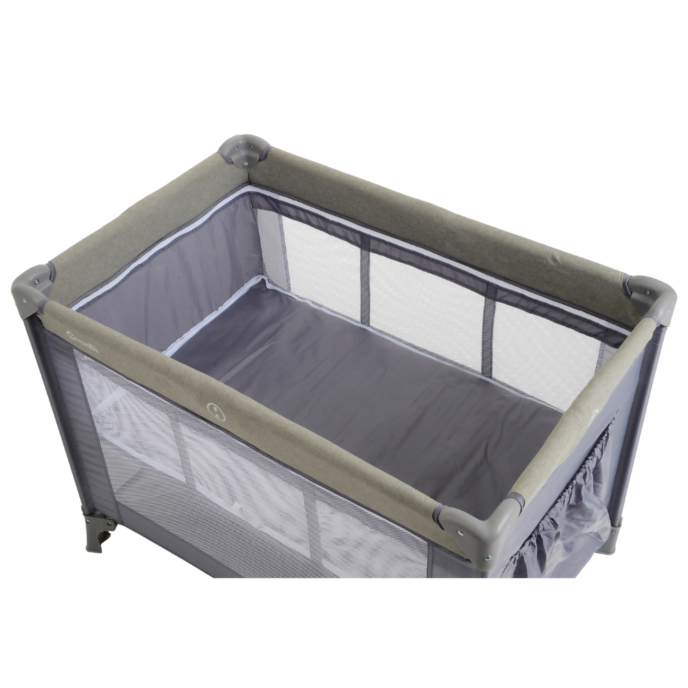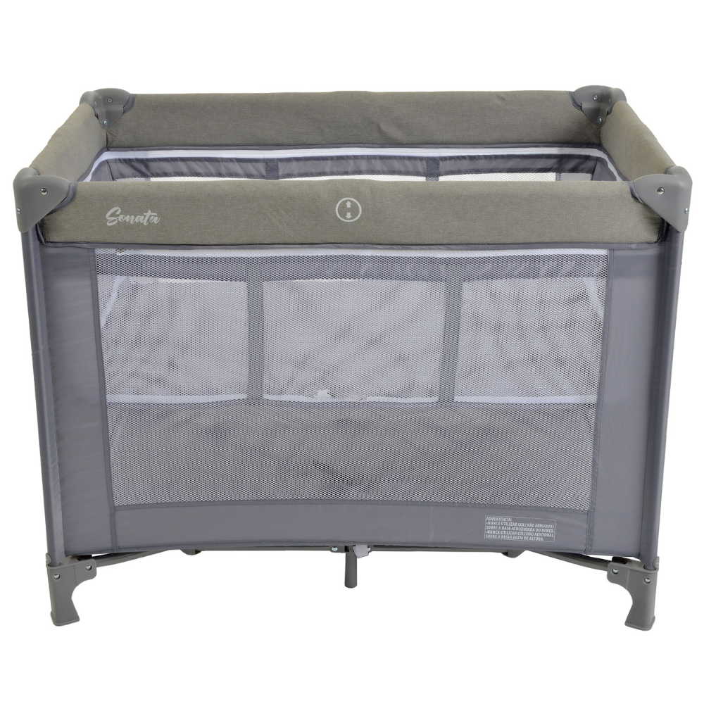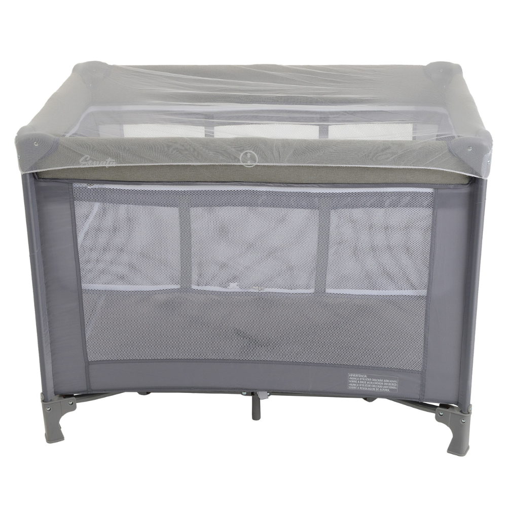 A estrutura é composta por tubos de aço resistentes, garantindo estabilidade, enquanto as laterais em tela proporcionam excelente ventilação e permitem a visualização do bebê a todo momento. Para maior tranquilidade, o modelo possui travas de segurança nos quatro lados e no fundo do berço, evitando fechamentos acidentais.