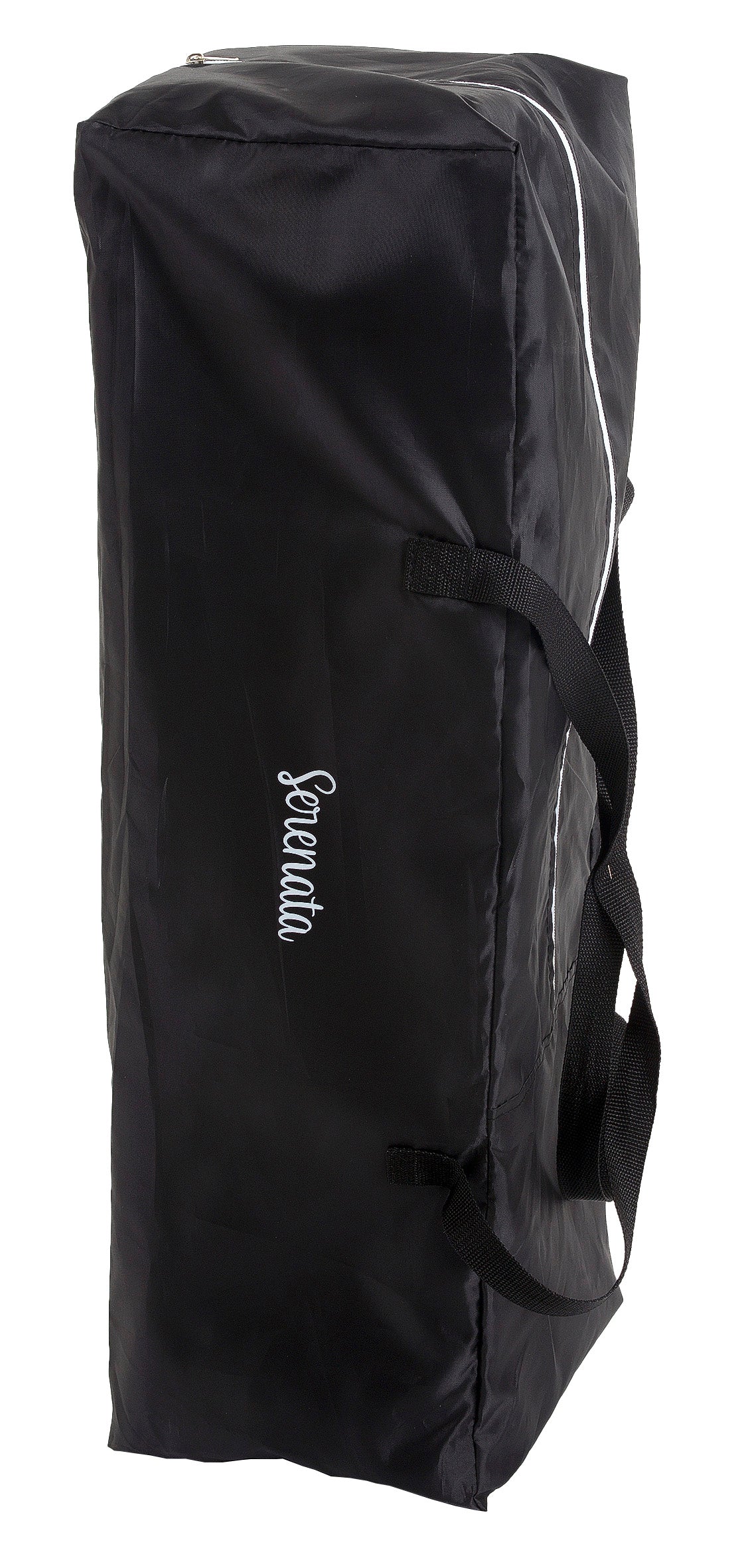 Quando fechado, o Serenata se torna extremamente compacto e fácil de transportar, acompanhado de uma bolsa exclusiva que facilita o armazenamento e o uso em viagens. Sua estrutura é composta por tubos de aço resistentes, com peças plásticas em polipropileno e nylon, além de tecidos em 100% poliéster, garantindo durabilidade, leveza e facilidade na limpeza.