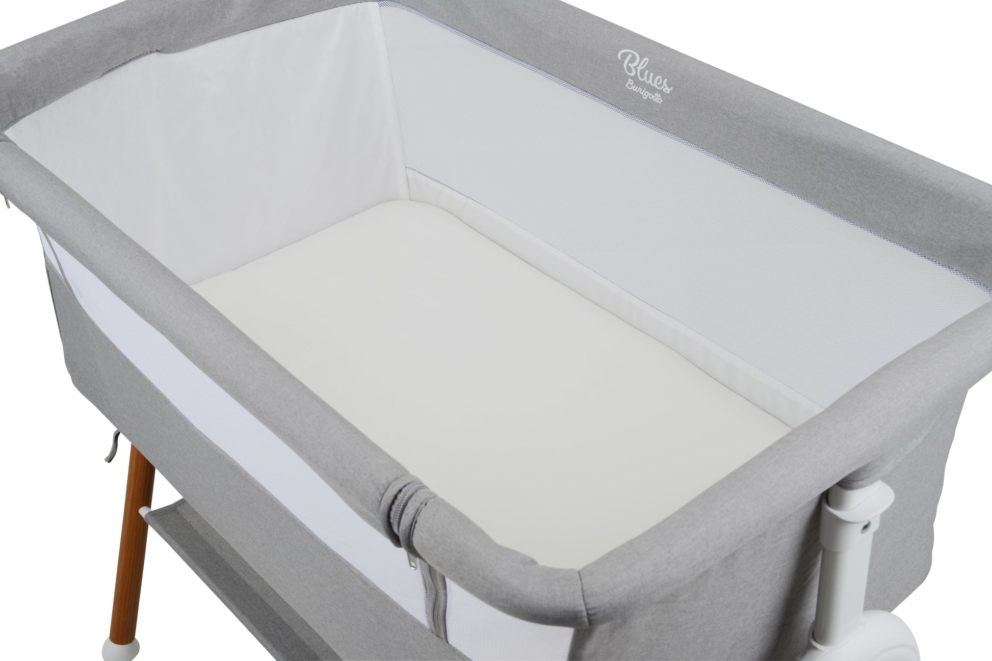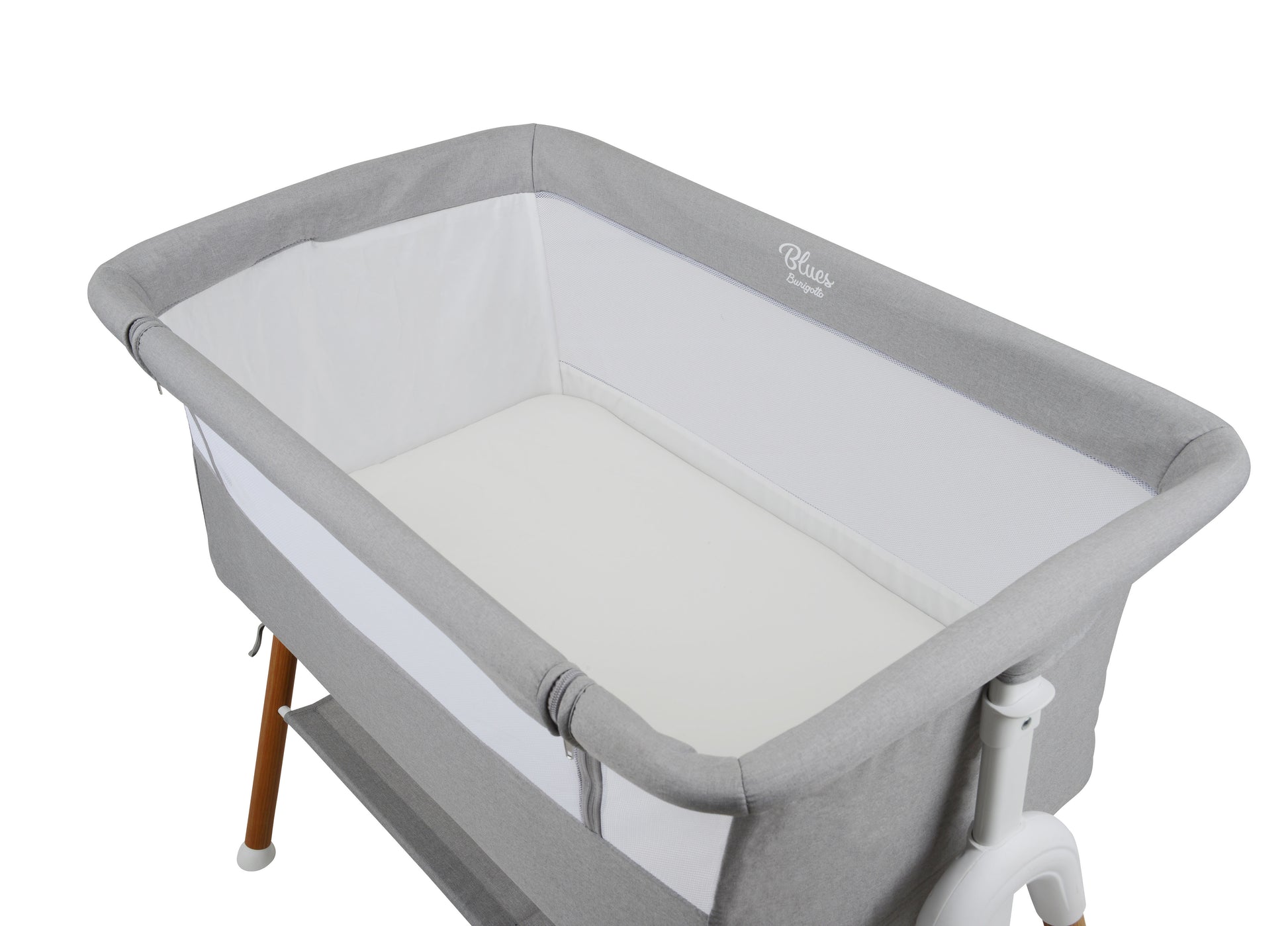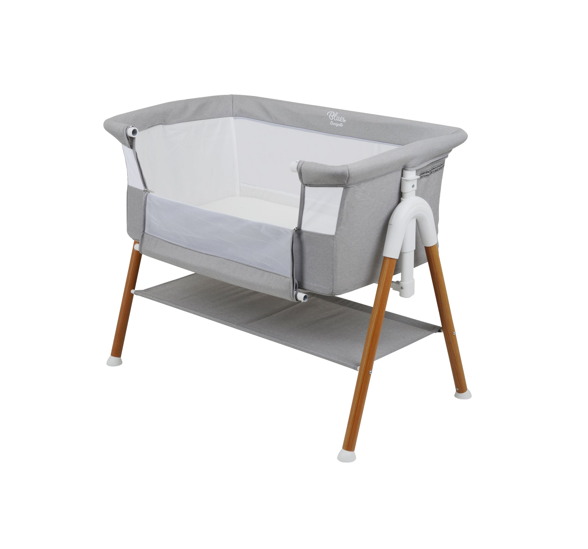 Sua estrutura conta com laterais em tela, oferecendo excelente ventilação e permitindo maior visibilidade do bebê durante toda a noite. O revestimento em tecido 100% poliéster garante durabilidade, fácil limpeza e toque suave. Um dos principais diferenciais do Blues é o seu sistema de ajuste em 5 posições de altura, permitindo adaptar o coleito perfeitamente à cama dos pais e até mesmo ajustar a inclinação lateral — ideal para promover mais conforto em casos de refluxo, deixando as pernas em alturas diferentes.