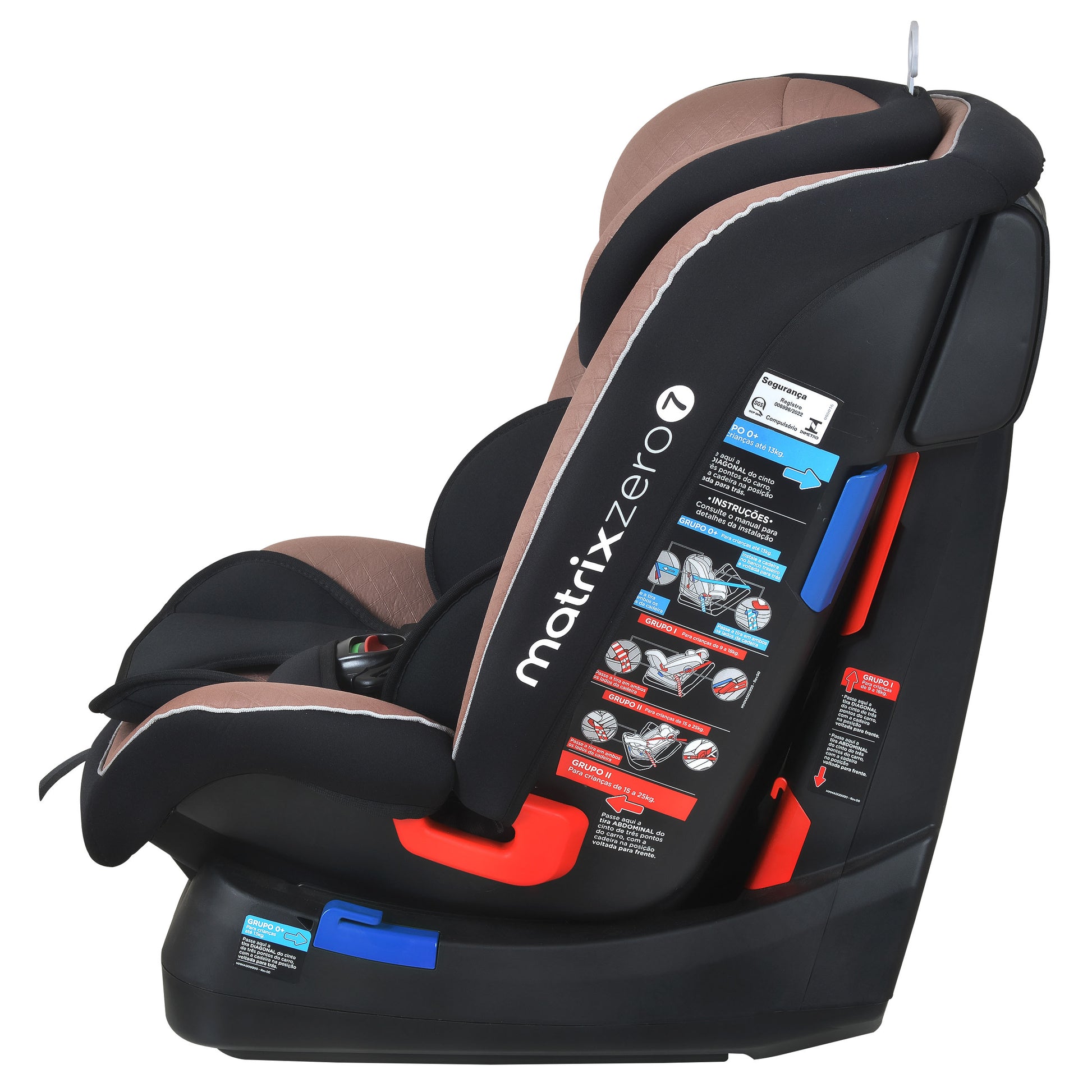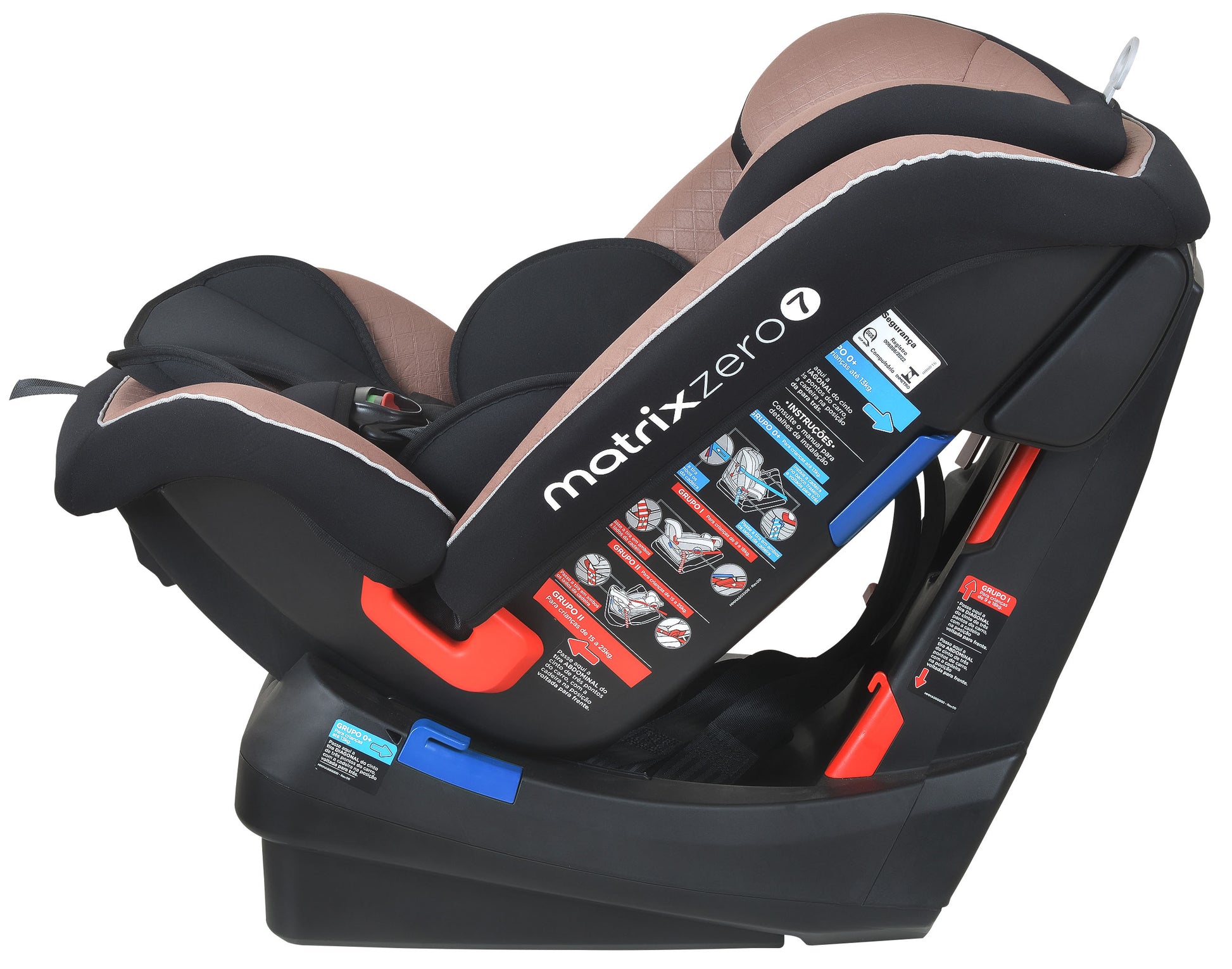 O sistema reclinável em 5 posições permite que a criança viaje de maneira confortável e segura, especialmente em trajetos mais longos. O design inteligente da Matrix Zero 7 conta com protetores acolchoados nos ombros, estrutura em plástico de engenharia leve e resistente, e um compartimento exclusivo que permite ocultar o cinto da cadeira quando utilizada para o Grupo 2, sem precisar removê-lo.